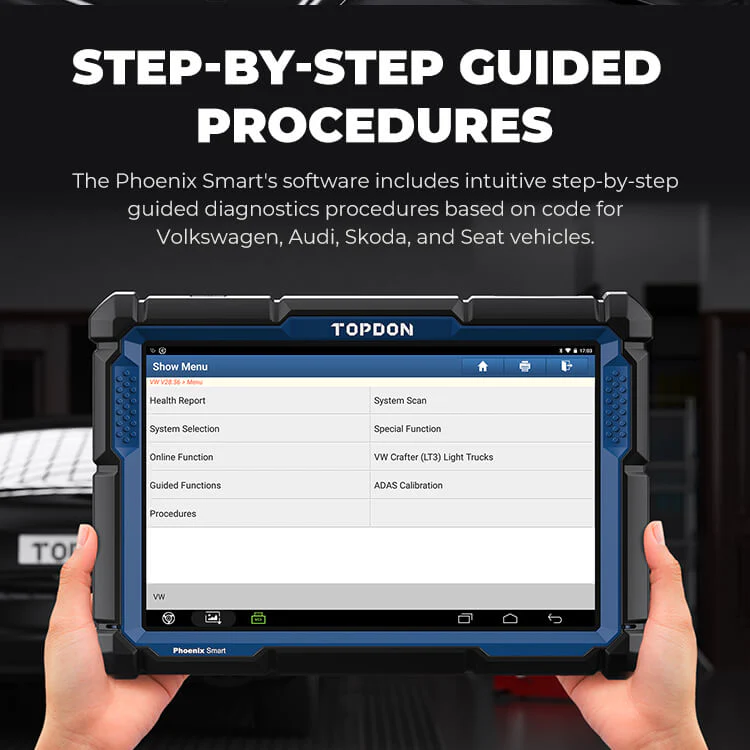 • Guided procedures and functions streamlines the repair process. Follow the prompts for easy and convenient operation, suitable for VW, Audi, Skoda and SEAT vehicles.