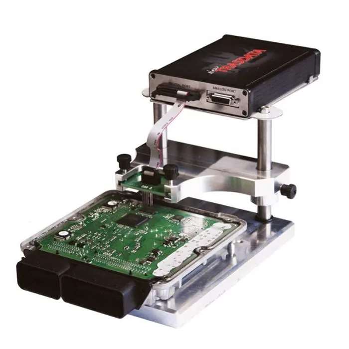 New Trasdata allows the reading and programming of the whole content of the ECU: microprocessor (CPU)flash Eprom and serial Eeprom. A wide variety of operations is therefore supported: after the initial reading, it is always possible to retrieve the original ECU content even in the case of blocking (back-up). This tool also perform autonomous checksum recalculations to ensure normal engine working conditions after the modification. The operations can be performed without any physical soldering/desoldering intervention: a metal positioning frame provided with specific terminal adapters create the connection between the ECU board and the tool. In specific cases, it is possible to perform reading/writing operations without even opening the ECU.